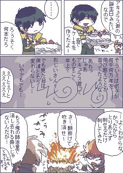 おめでとう web拍手でアキュラスさんの誕生日を教えて いただいた時に描いた絵日記からの使い回しです。もう食べれないケーキ。 ≪戻 ■ 進≫